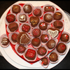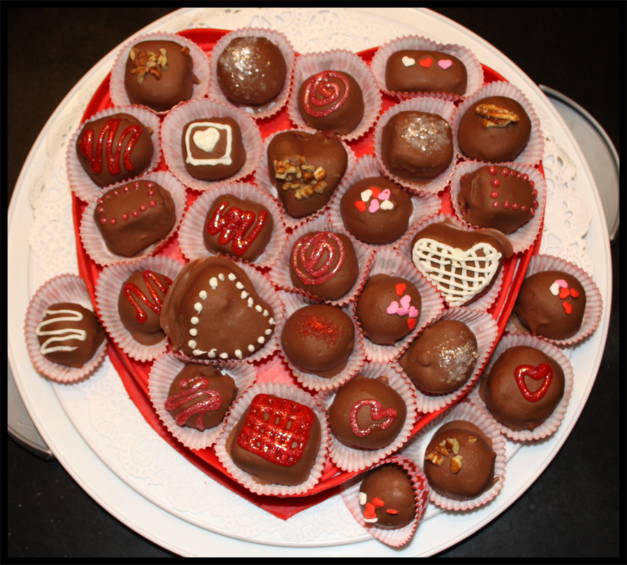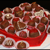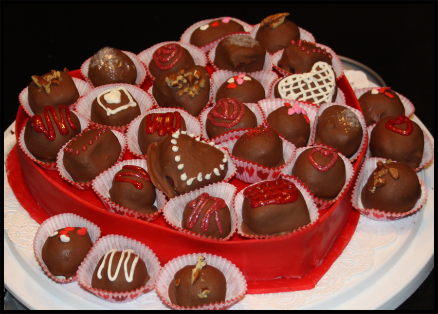Got the idea from bakerella.com Red Velvet cake in heart shape with fondant accents to make it look like a chocolate box. Assorted Chocolates are cake balls.