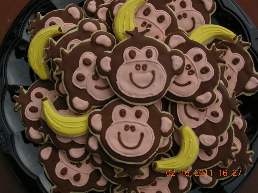 Monkey cookies for baby's first birthday. I couldn't resist throwing in a couple of bananas for fun!