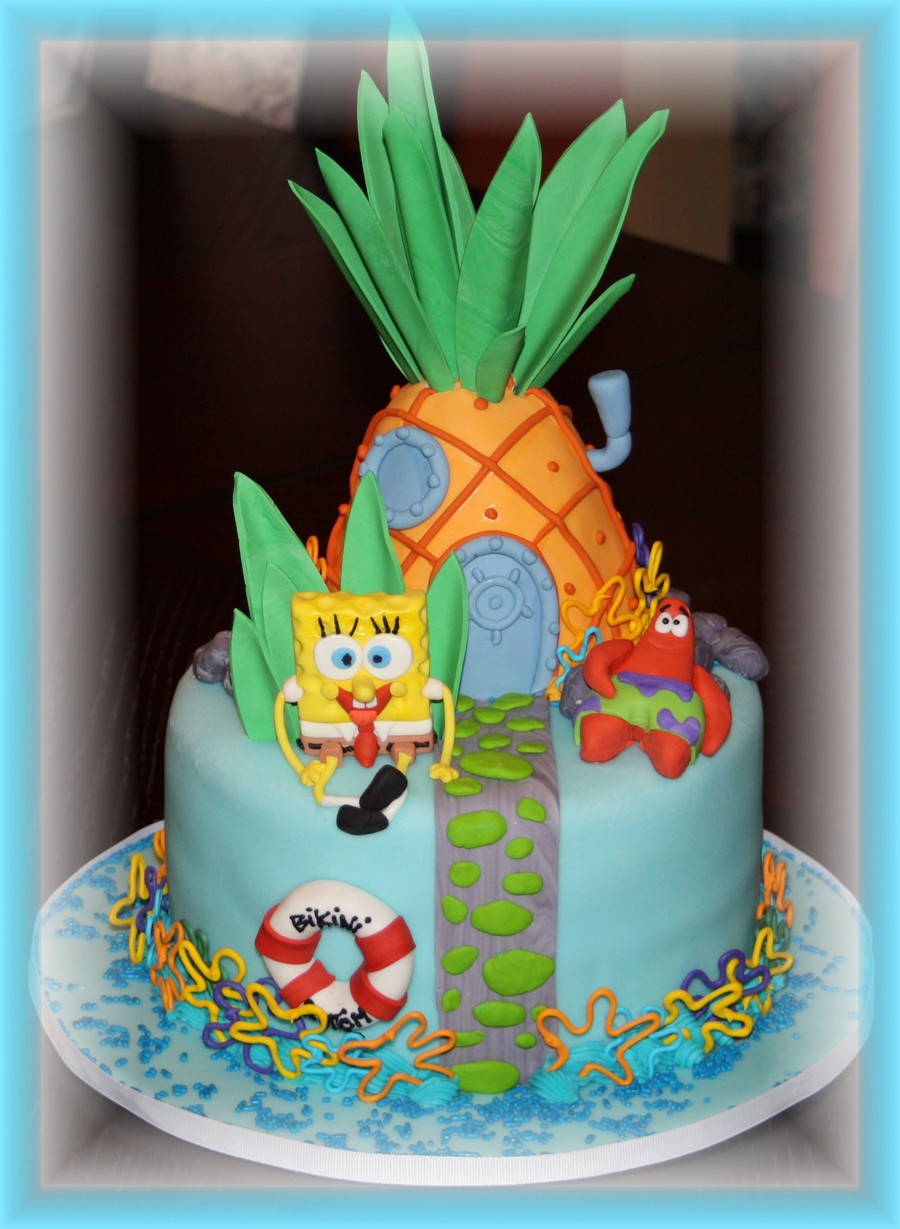 Chocolate cake covered and decorated with fondant and gum paste; I used rice krispees cereals for Sponge Bob's house.