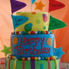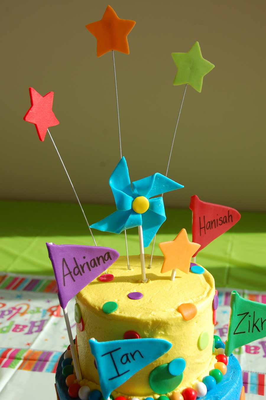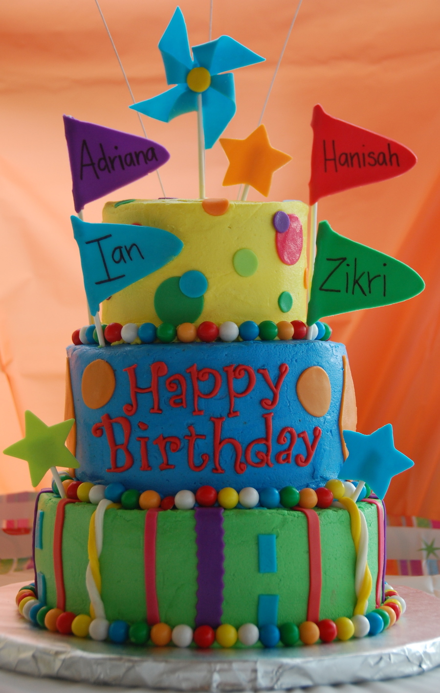 This cake was made for 4 different kids joint birthday party that was a carnival themed. Parents wanted colors to match decorations and asked for a pinwheel and flags. 10' 8' 6' cakes, all different flavors, covered in BC and used fondant accents. The borders are gumballs