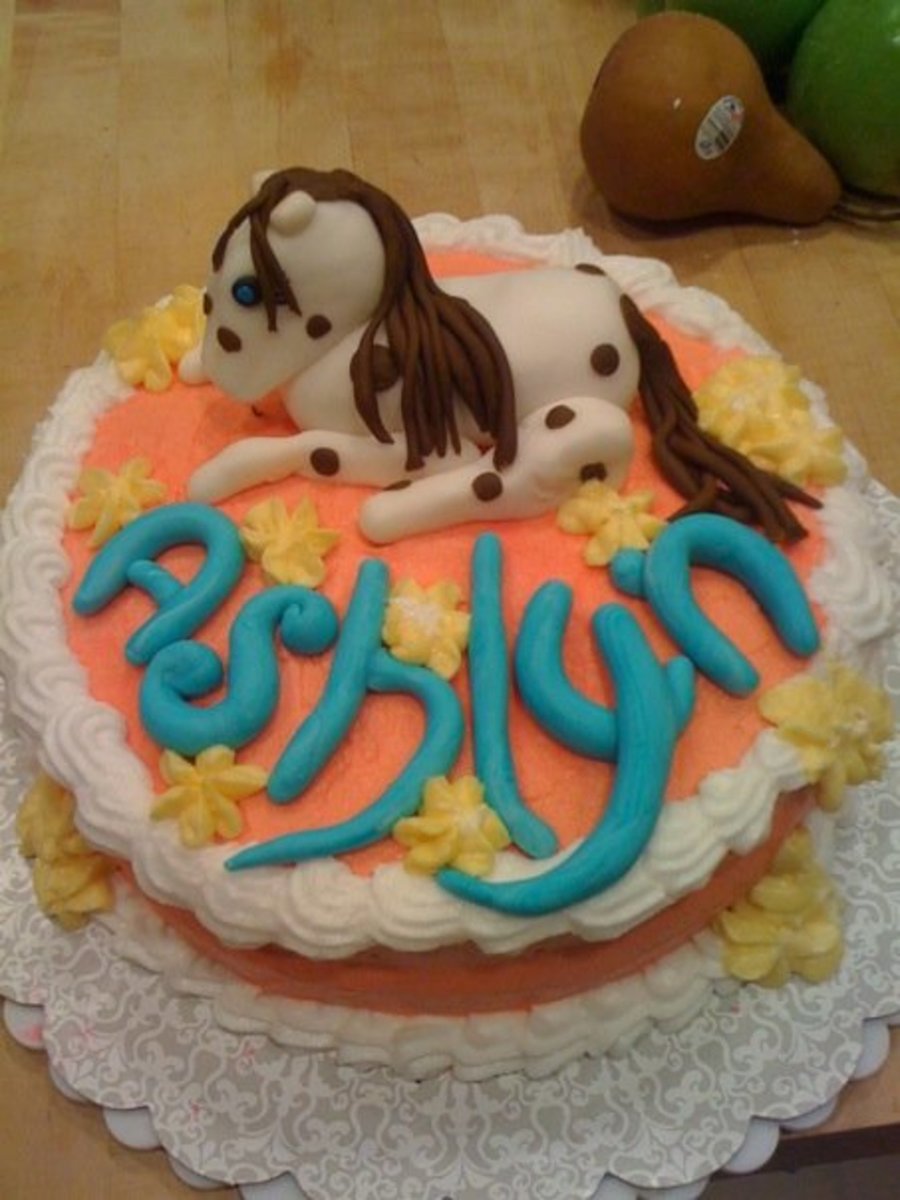 Iced with buttercream, fondant pony, all other accents are buttercream. It was a really hot day and the buttercream was just melting off, but the pony came out too cute!