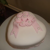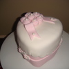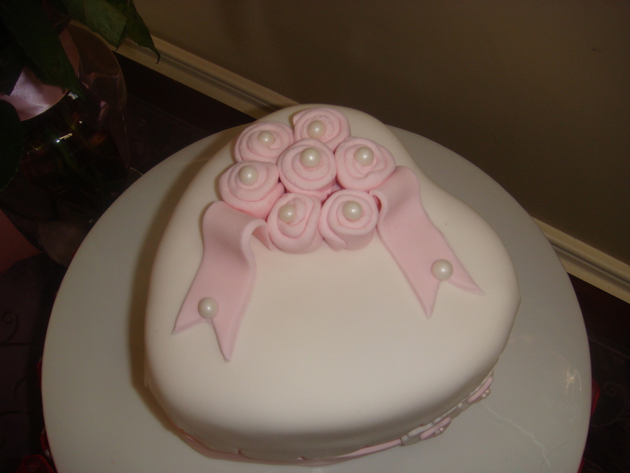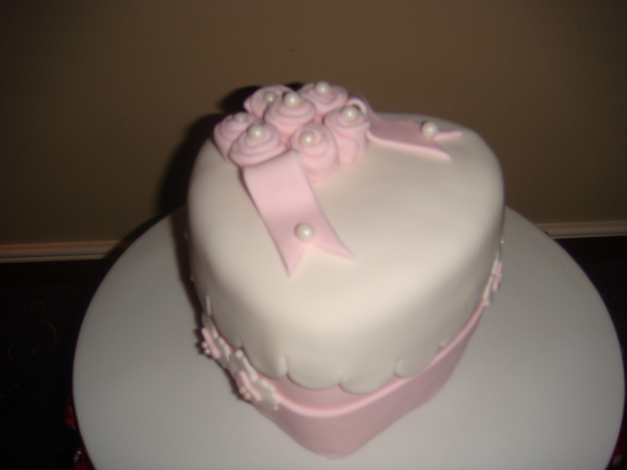 This was for my mom. All fondant including rolled roses and bow tails with pearl dragees dusted in pearl lustre dust. Cake was strawberry with strawberry cc filling and VBC.