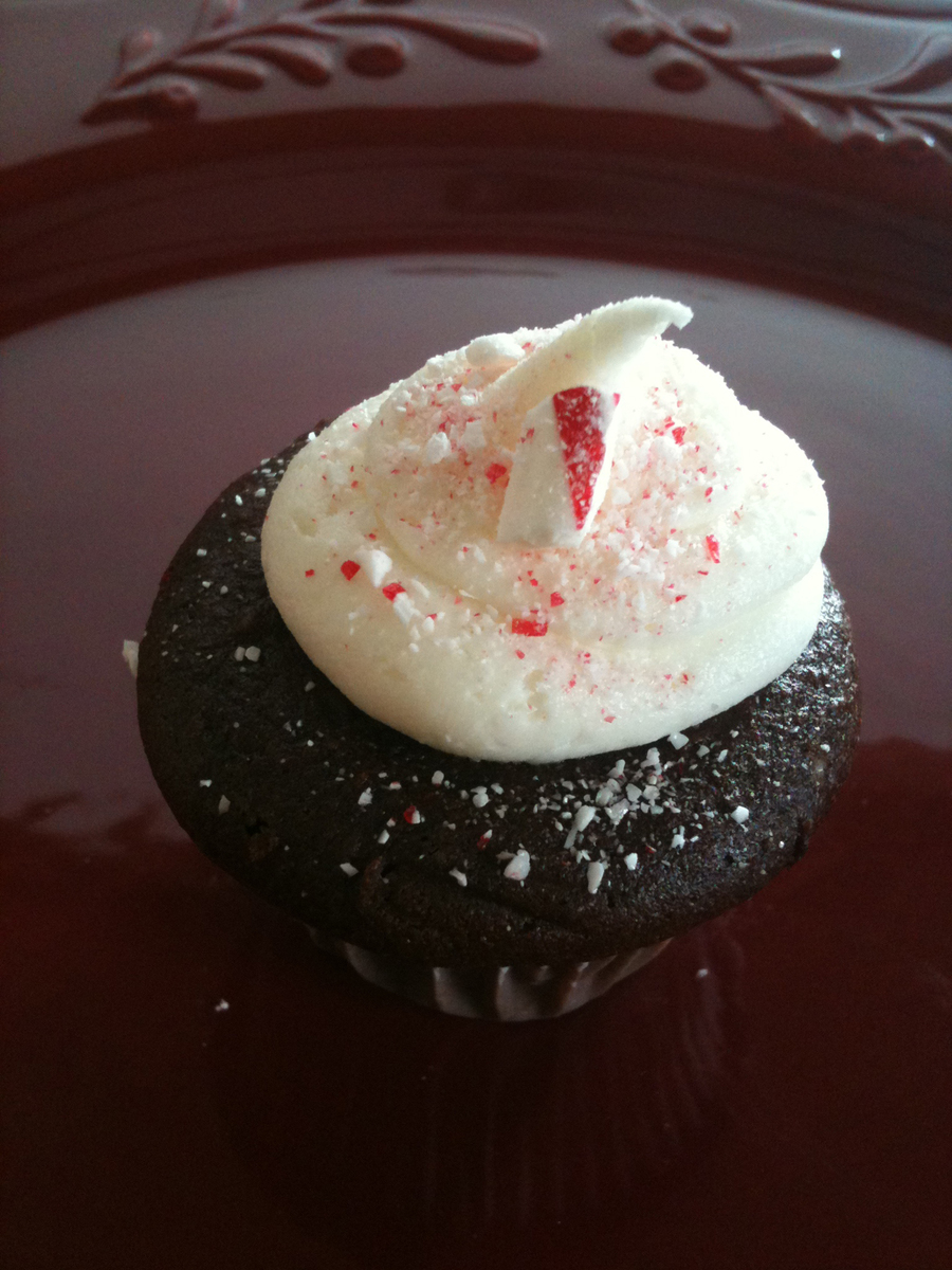 Mini chocolate cupcakes topped with Peppermint buttercream and crushed candy cane.