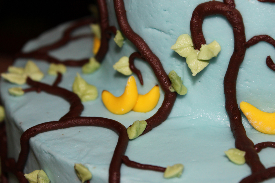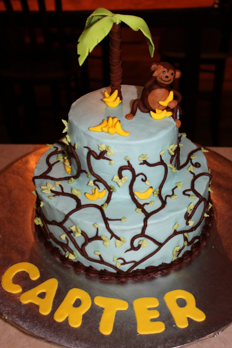 2-tier cake with buttercream frosting, with chocolate buttercream vines and buttercream leaves. Topped with fondant palm tree, monkey and bananas.