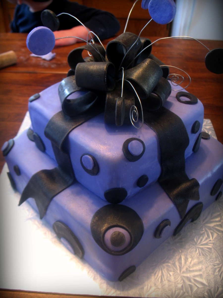For a 12 years old's birthday. She wanted purple fondant with a black bow and circle accents. MMF on buttercream. MMF + gumpaste for the bow. 12 gauge stainless steel used for accents around the bow.