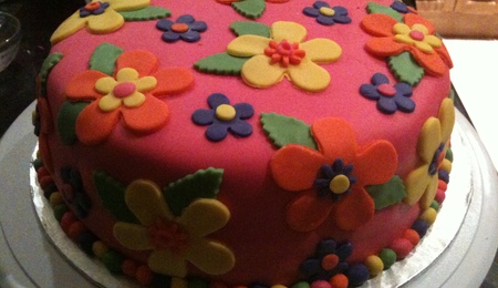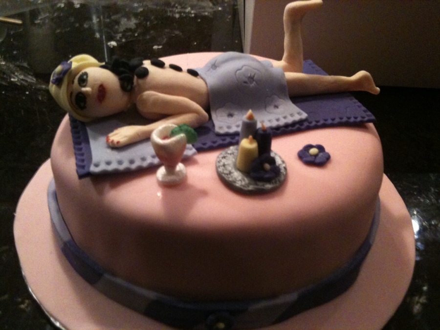 I am very hesitant to post this photo because I still so new at this, and there are a lot of flaws in my work still. This is the Pink Champagne cake with raspberry cheesecake mousse (both recipes on CC) that is covered in pink fondant. I used a 50/50 gumpaste and fondant mixture for the girl. Since it was my first time using the mixture, I was unused to how quickly it begins to harden and I ended up with wrinkles. I think I would cut back on the gumpaste a little next time...and learn to work a little quicker! It was fun. The inspiration came from a similar cake that I found from Ayes's cakes on Google images...so I can't take the credit for the design. That is a towel on her head with some black curly hair spilling out at her neck, and there are hot stones on her back.