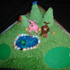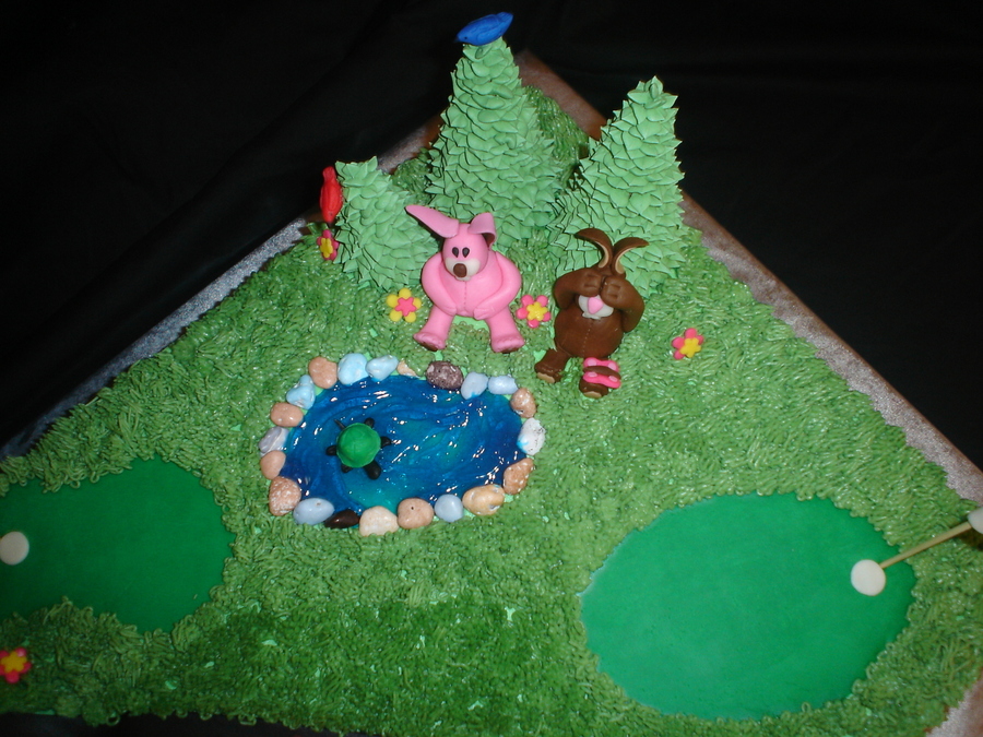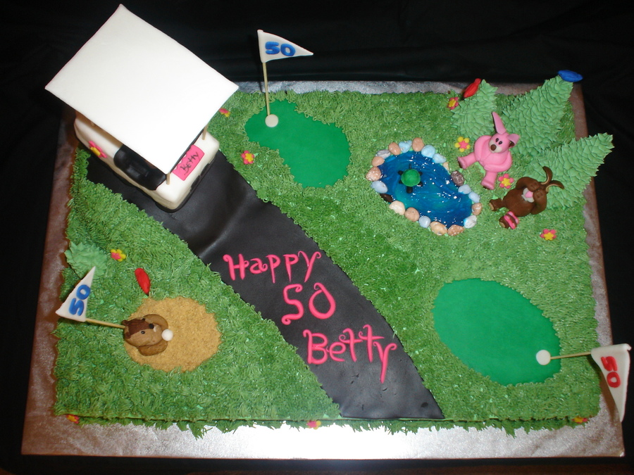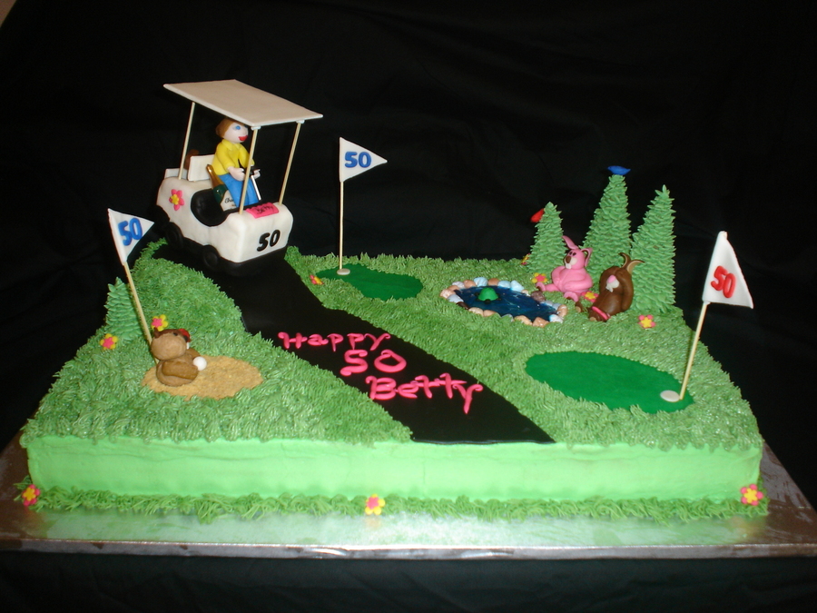 Made for a lady that teaches golf and turning 50. Chocolate cake with Ganache filling, buttercream frosting,golf cart made with RKT and FONDANT, decorations made of fondant.