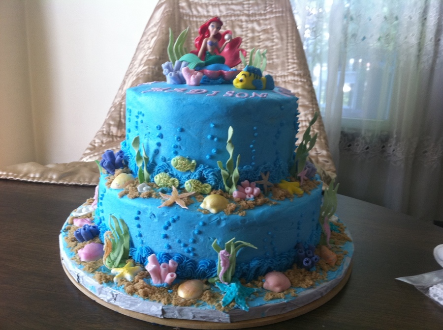 My first Tiered cake for a 1 year old BD. Buttercream with fondant embellishments-including Flounder. Ariel is purchased topper. Mother of the little girl provided a picture of what she wanted--I added a lot more embellishments--she loved it!