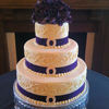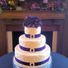 Ivory icing with Large scrolls, Artificial hydrangea flowers on top. Blue ribbon with buckle slides.