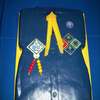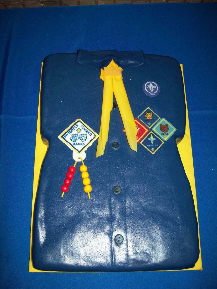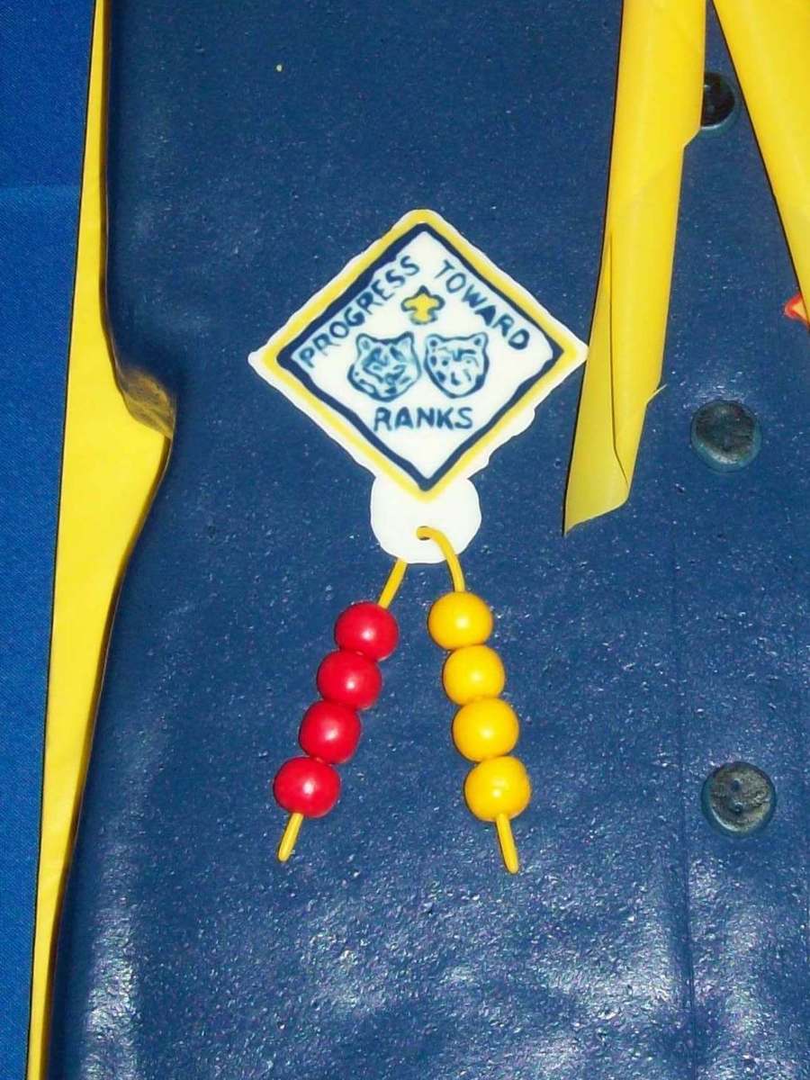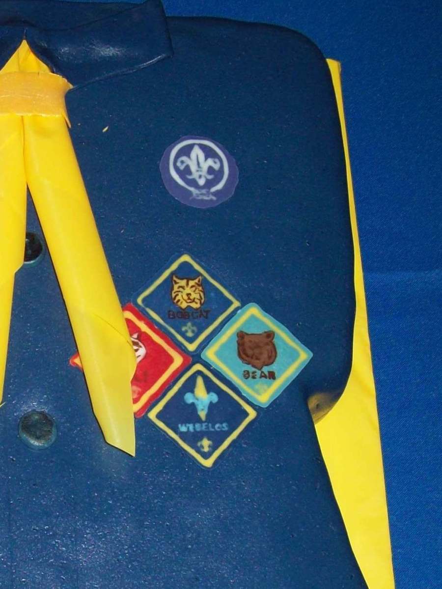 Cake made for DS's Blue & Gold Dinner. My first fondant cake! Inside is yellow cake with blueberry filling (also blue & gold!), crumb coated with BC and covered in MMF. Patches are all chocolate transfers (first time for those as well), beads and laces are MMF. Yellow fondant was NOT cooperating, so I had to use part of the plastic tablecloth that I used to cover the cake board to make the neckerchief...but the slide is MMF. Cake design modeled after one I found online.