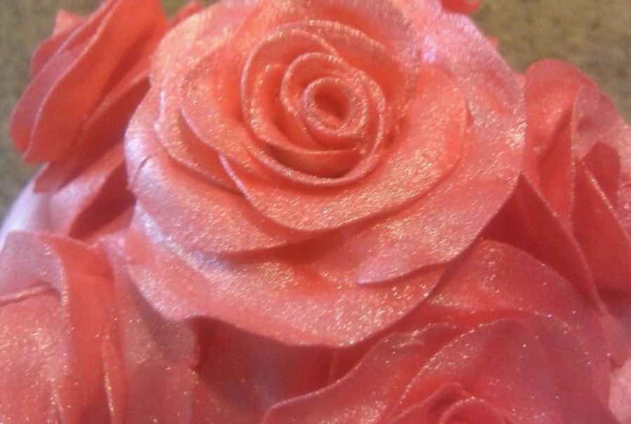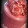 pink mmf covered cake with buttercream trim and gumpaste roses