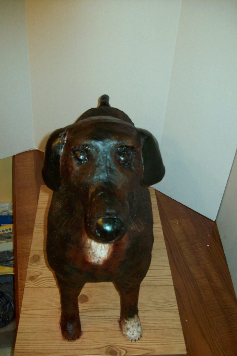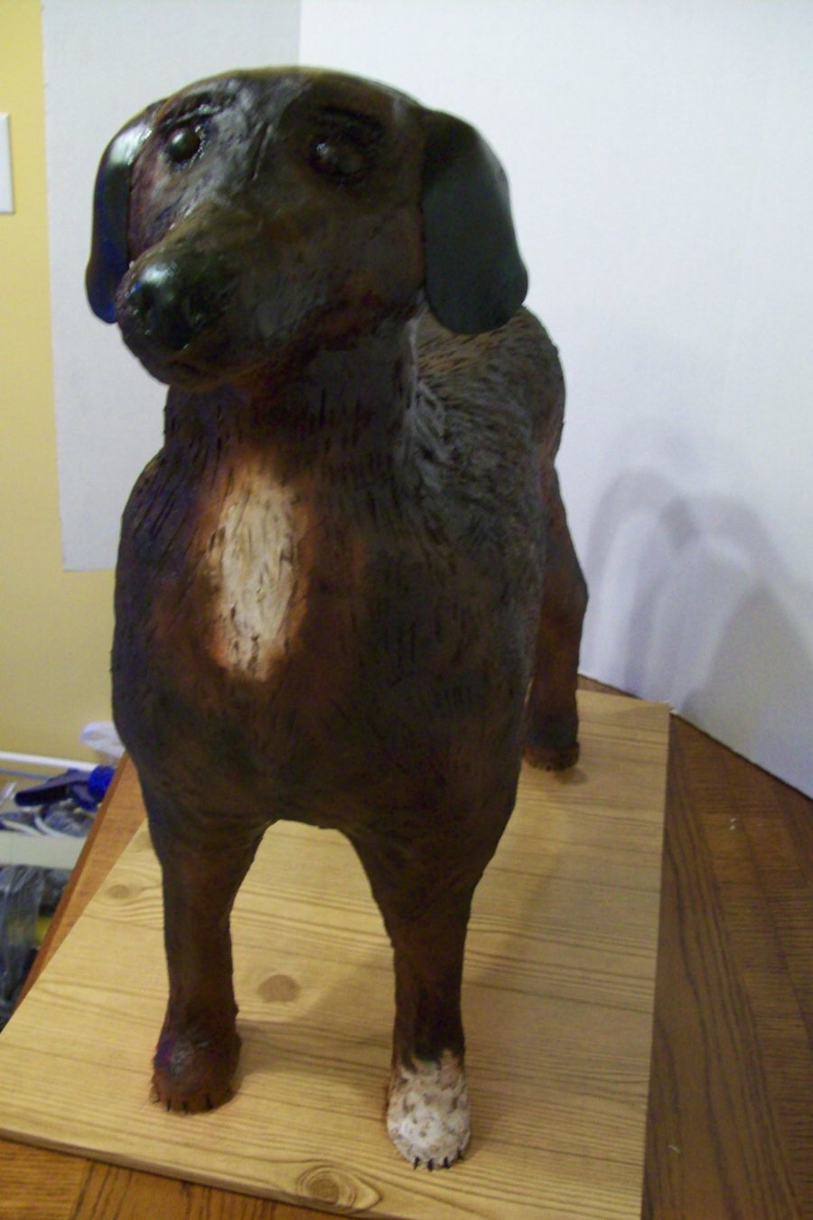 This is a full sized dog over 2 feet tall and almost 3 feet long! My hubby built the structure, and I used 11 batches of RKT for the legs, belly and head. The body was vanilla cake w/ mocha filling, all covered in BC. Thanks so Rebecca (BosCakes) and Jane (SweetJane) for their help!!!