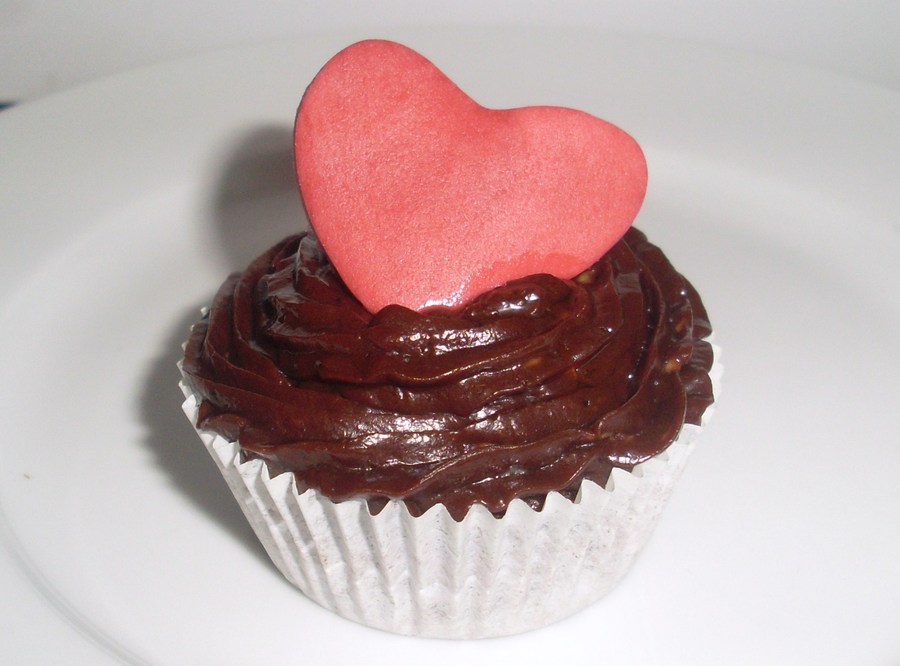 my first chocolate fudge cupcake. i havnt piped on cupcakes before either, so it was a bit of an experiment! fondant heart on top. my 2yr old son told me it was yummy, so i guess they came out ok!
