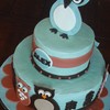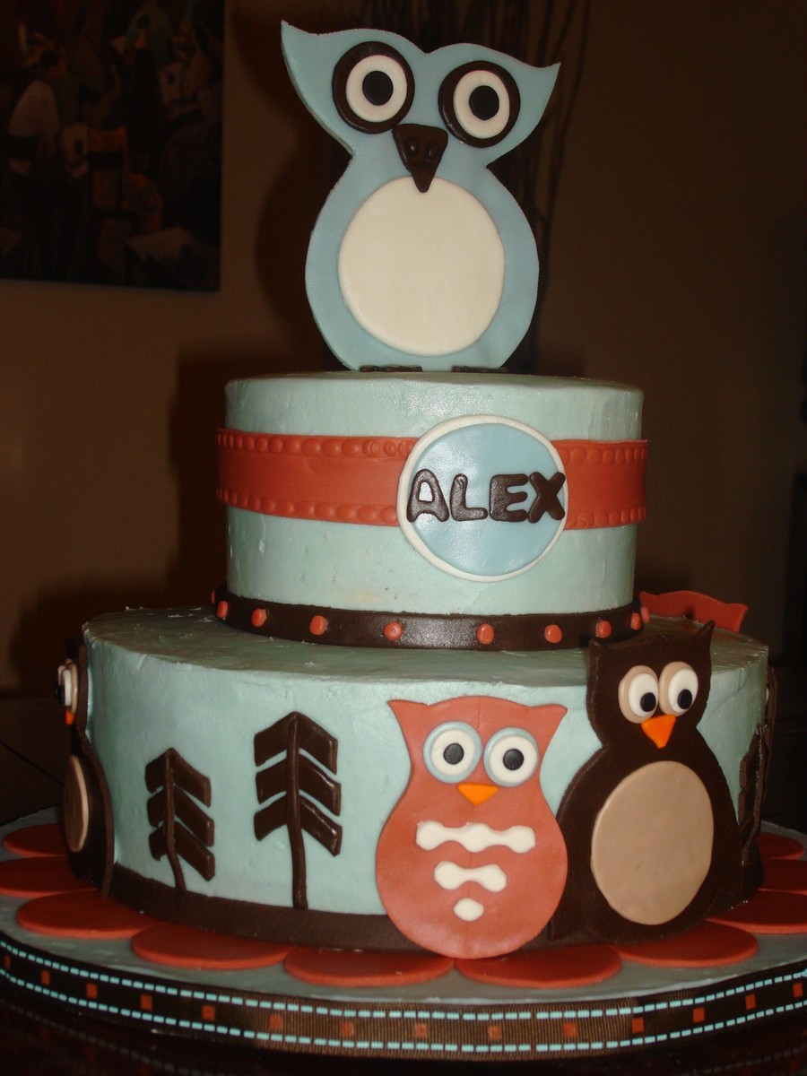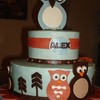 Baby Shower cake based on the baby's crib bedding called "Hooty" by Sweet Kyla. 10" and 6". Vanilla with Raspberry custard filling. Chocolate with chocolate truffle filling.