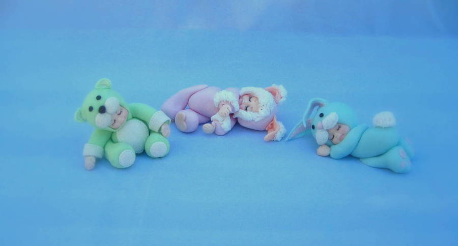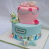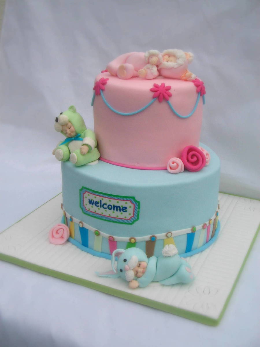 A christening cake for triplets. 8" chocolate & 5" white chocolate round cakes. Gum paste babies, edible image (welcome). I used the Holly baby head mold for the heads.