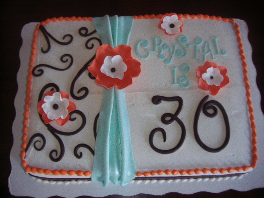 Had to make this cake for a girl who loves orange & brown. I came up with the aqua color to make it prettier. They needed a sheet cake to stay in their budget, so I tried to make it look a little more updated for a sheet cake with fondant & the design.