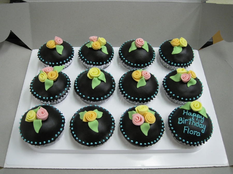 Chocolate cupcakes with milk chocolate/vanilla buttercream frosting. Covered with black fondant and turquoise royal icing dots. Fondant roses and leaves.
