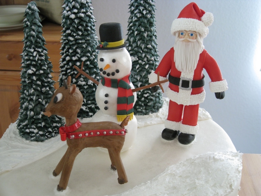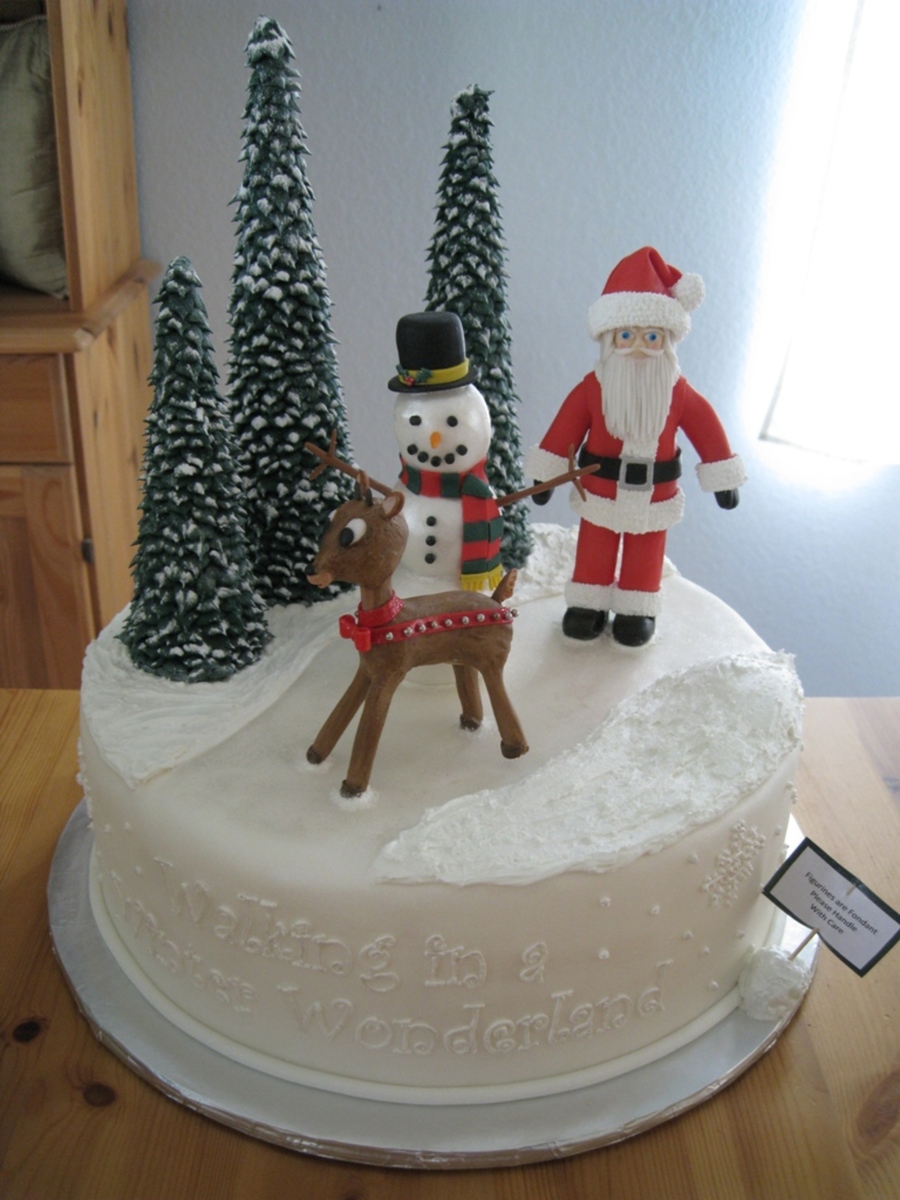 Round cake dummy covered in fondant with royal icing "snow" mounds and lettering dusted with pearl dust. Trees are royal icing. Reindeer, snowman and Santa are fondant/tylose. Won 3rd place in the holiday category at the county fair.