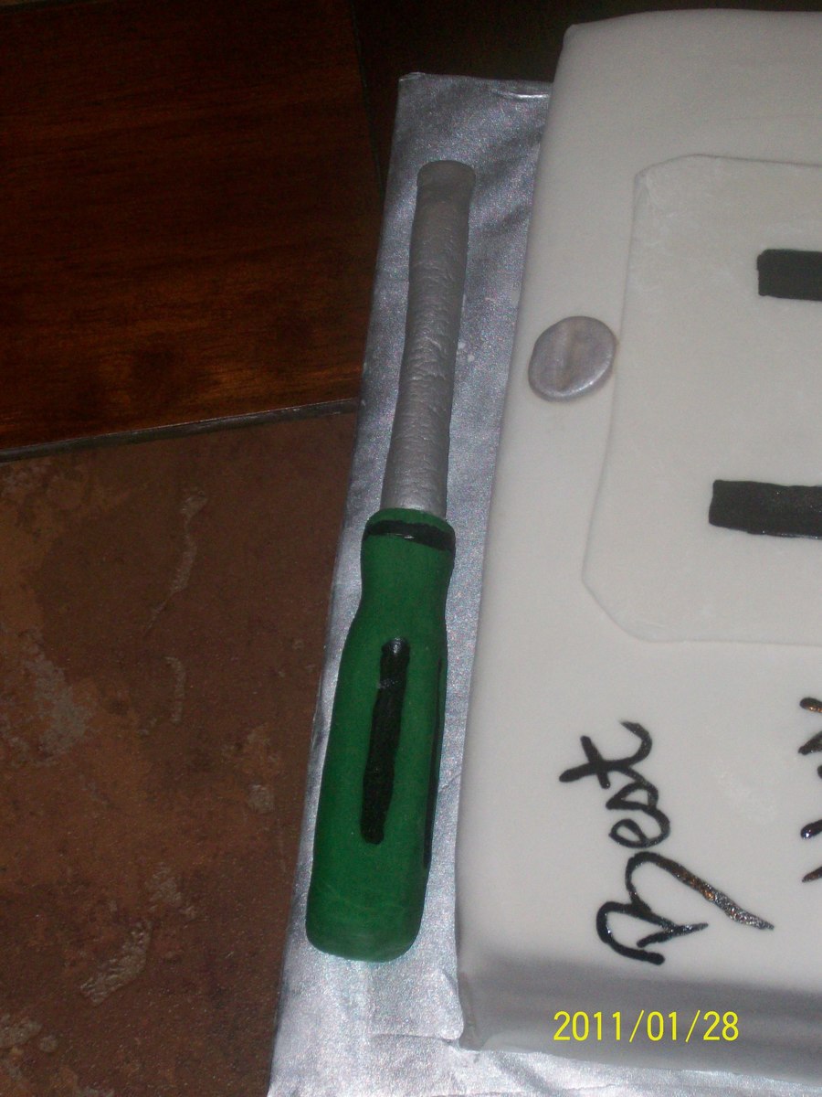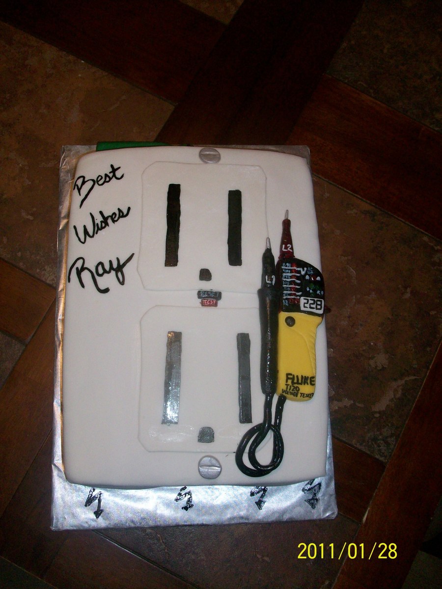 This was an electric socket cake made for someone who was leaving a job at the hospital and going to work as an electrician. The screwdriver and the tester were both made of fondant.