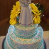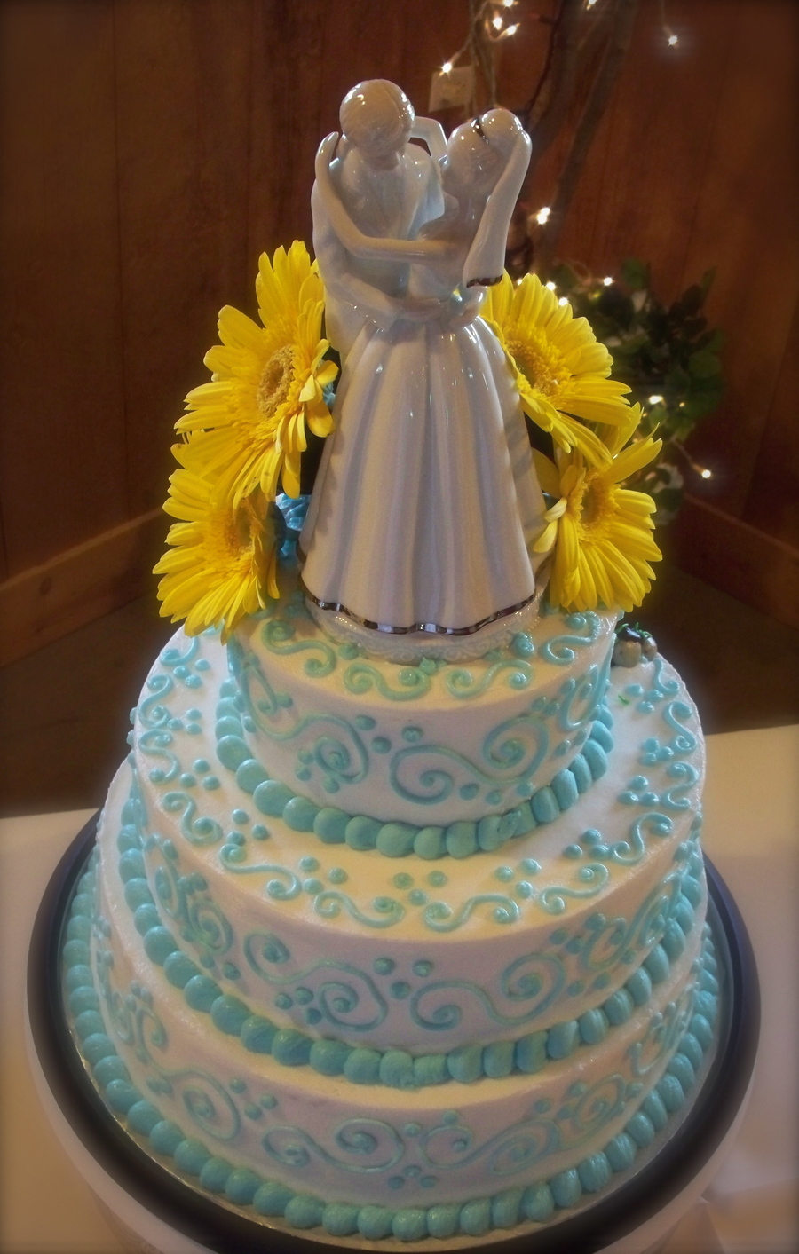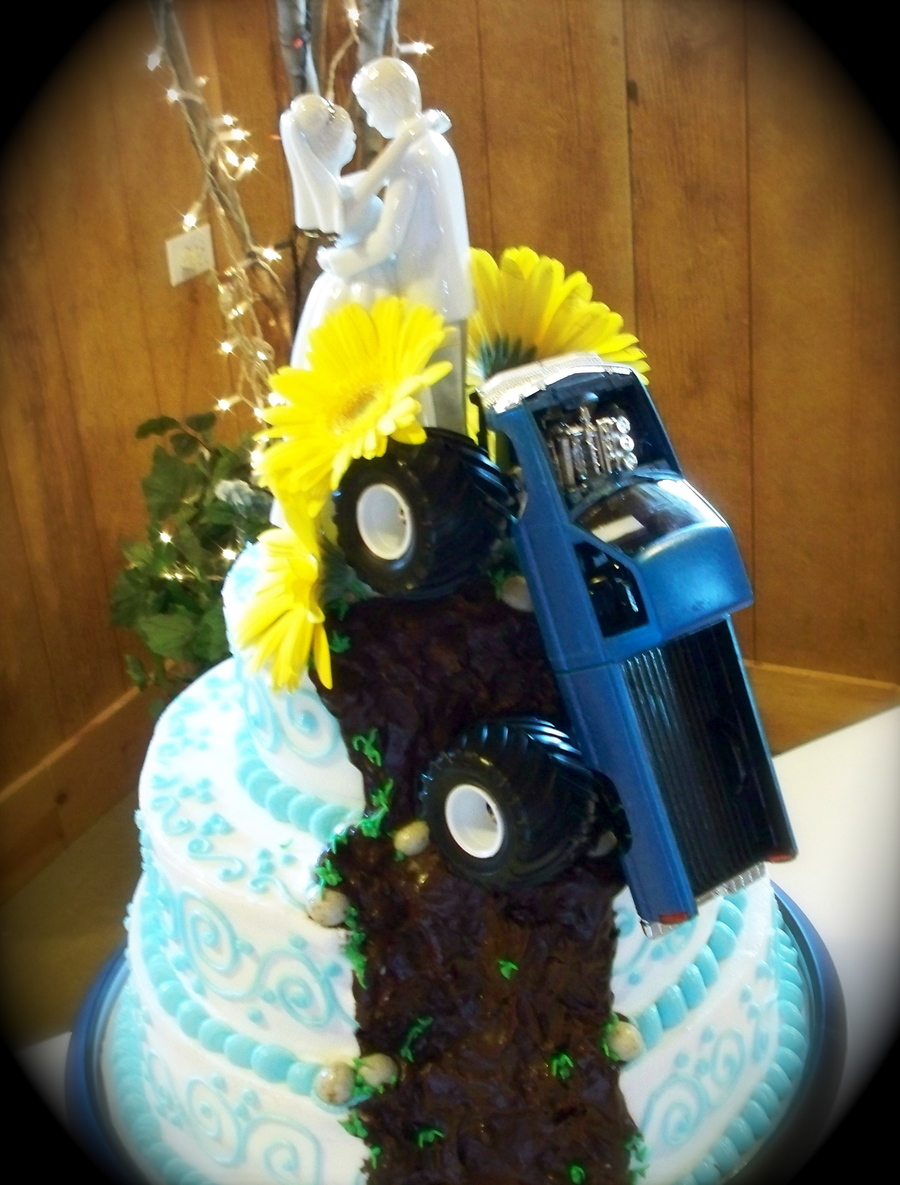 Two in one... Beautiful aqua swirled bridal cake on one side, Red Neck Mud Bogging Grooms cake on the back side