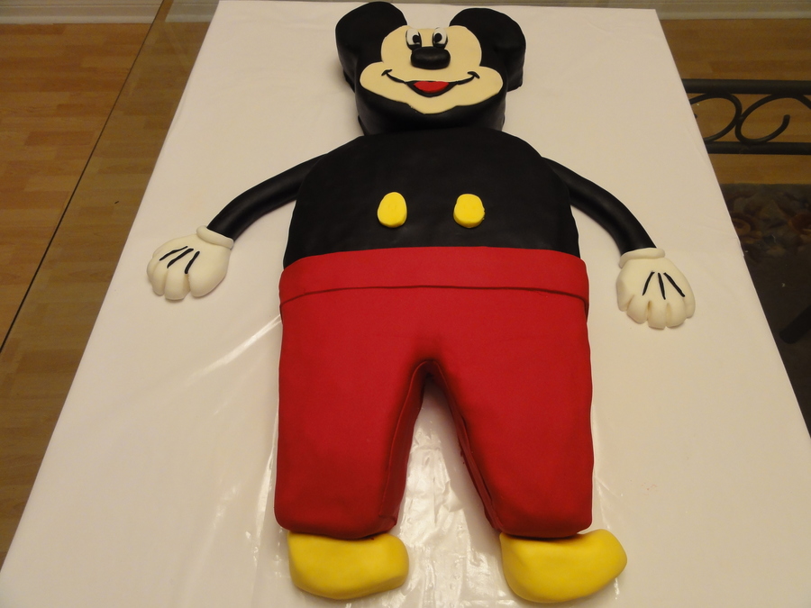 Mickey mouse cake made for a very special 1 year old. The head is red velvet cake with chocolate raspberry ganache filling. The body was strawberry shortcake. All covered in fondant.