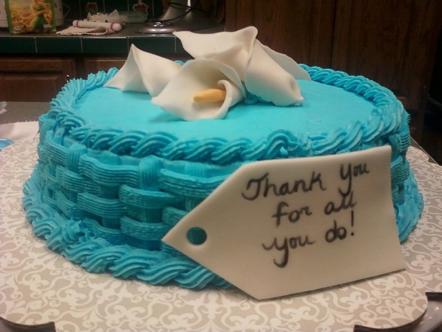 Made for a co-worker who always goes out of her way to help. 8" round with BC basketweave and lillies. This was only the 2nd time at basketweave, and the first time at fondant lillies, after watching a tutorial on you tube...TFL!!