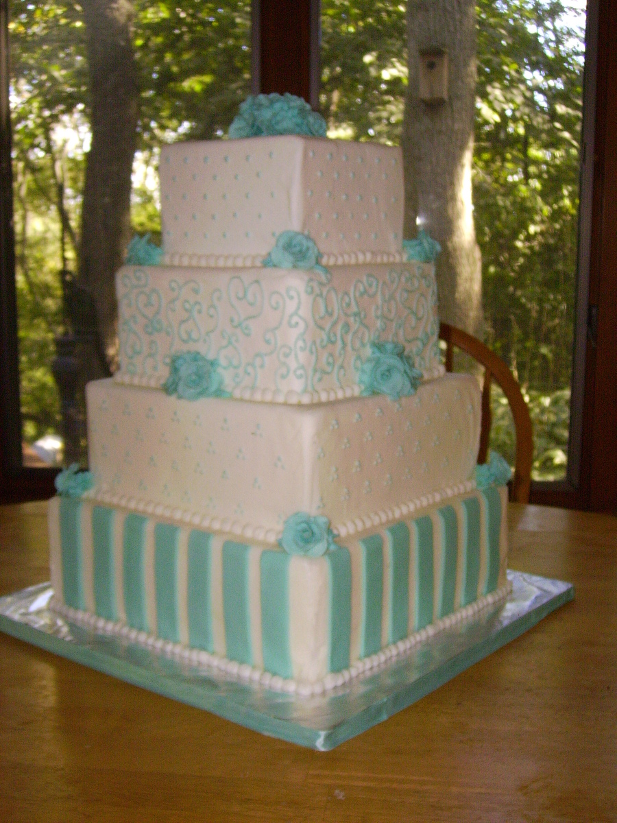 Buttercream frosted with gumpaste roses and fondant stripes on the bottom tier.
