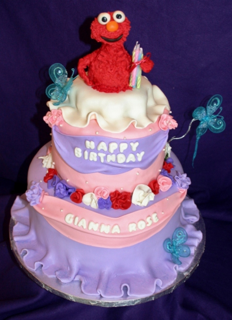 This was a hand made Elmo, done out of fondant & gumpaste, crowning the top of a sweet little girl birthday cake. The cake was both strawberry & chocolate with strawberry butter cream filling .
