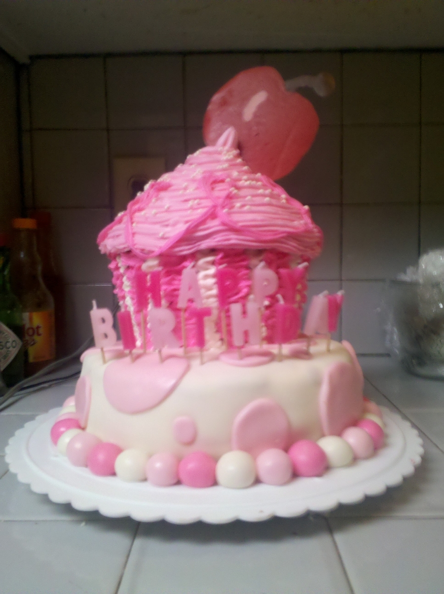 My first fondant cake, i didnt take any classes or do much research as i shouldve. i had set the giant cupcake on the cake without any support so it started smashing into the cake after a while. the cake is covered in fonddant, the cupcake in whip topping. the happy birthday are candles.