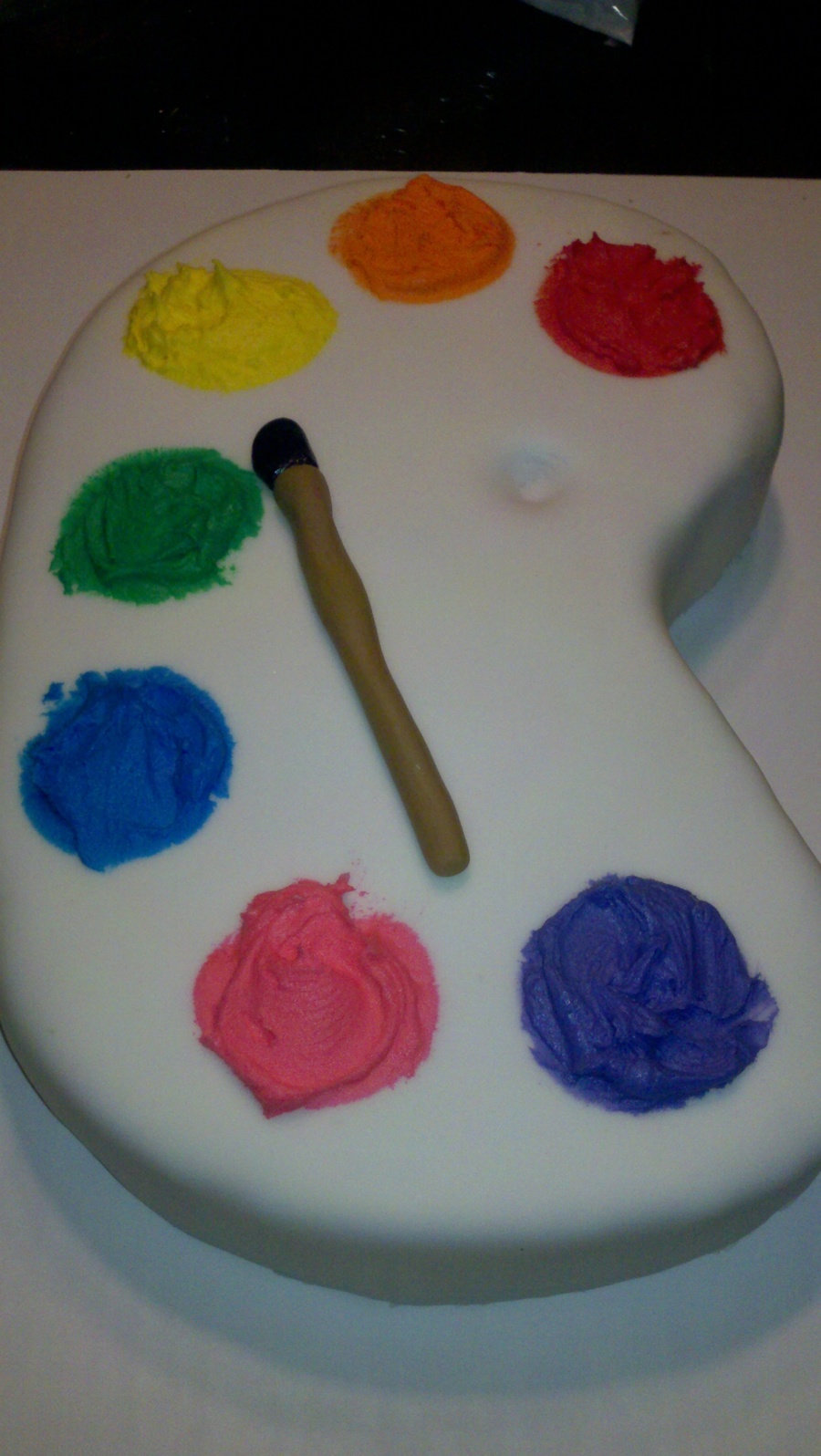 Covered in fondant with buttercream "paint". Paint brush also made of fondant.