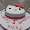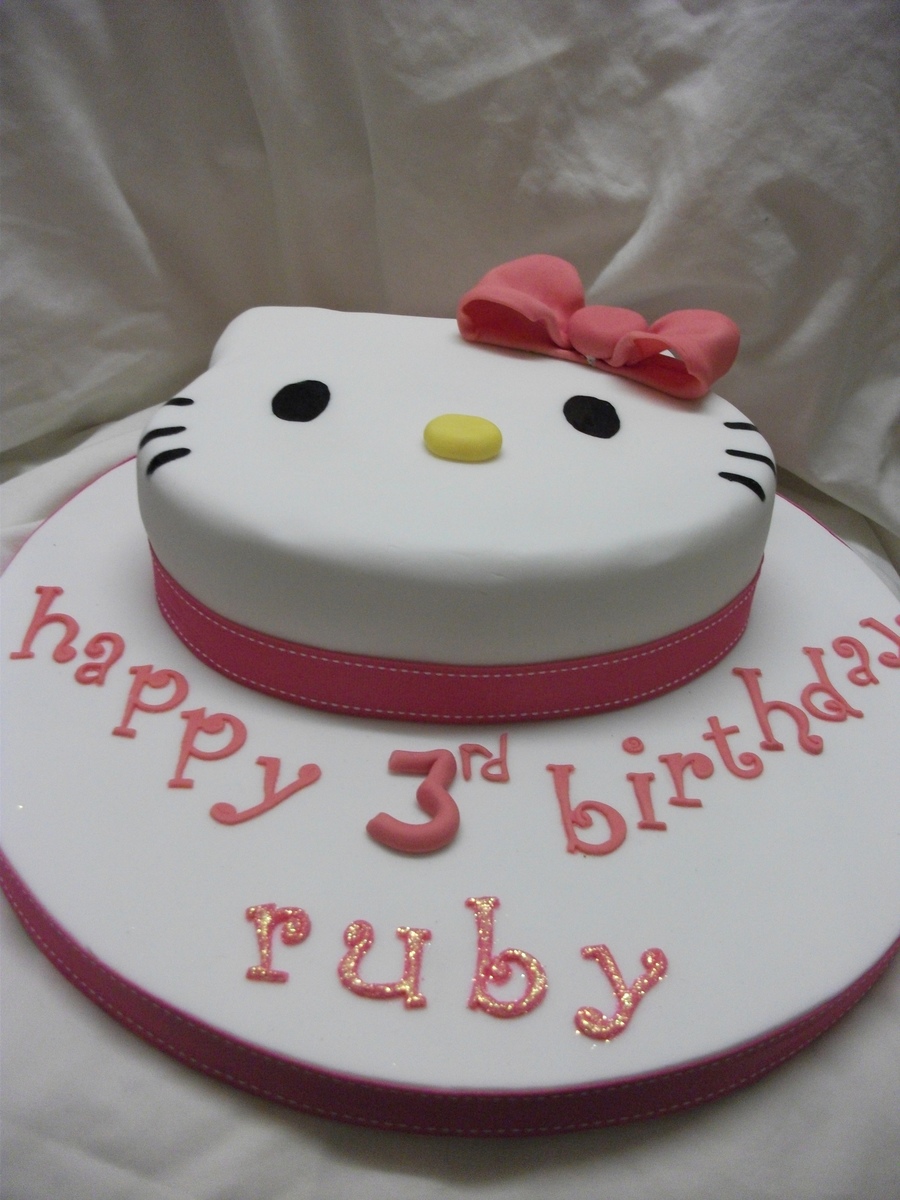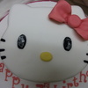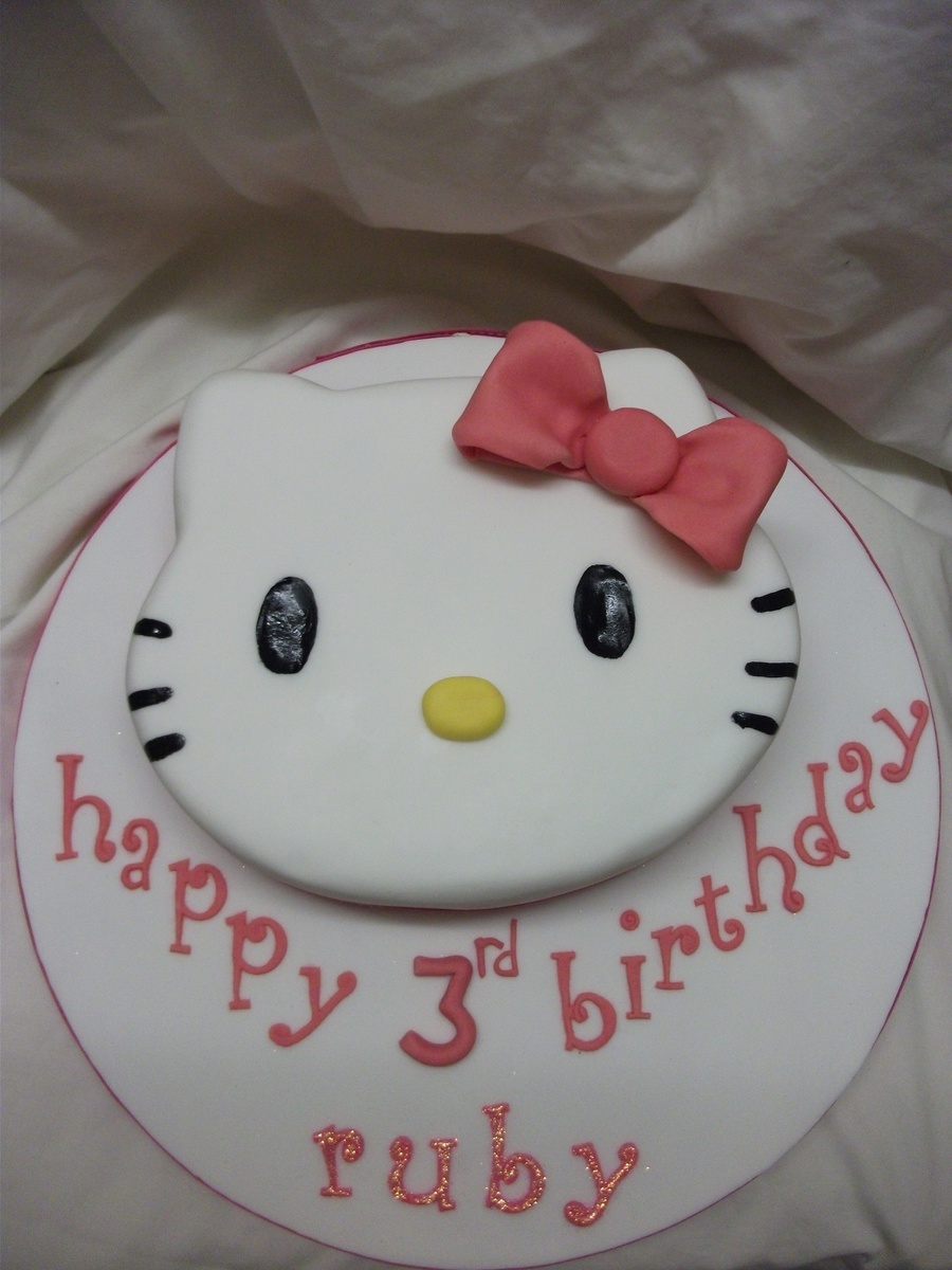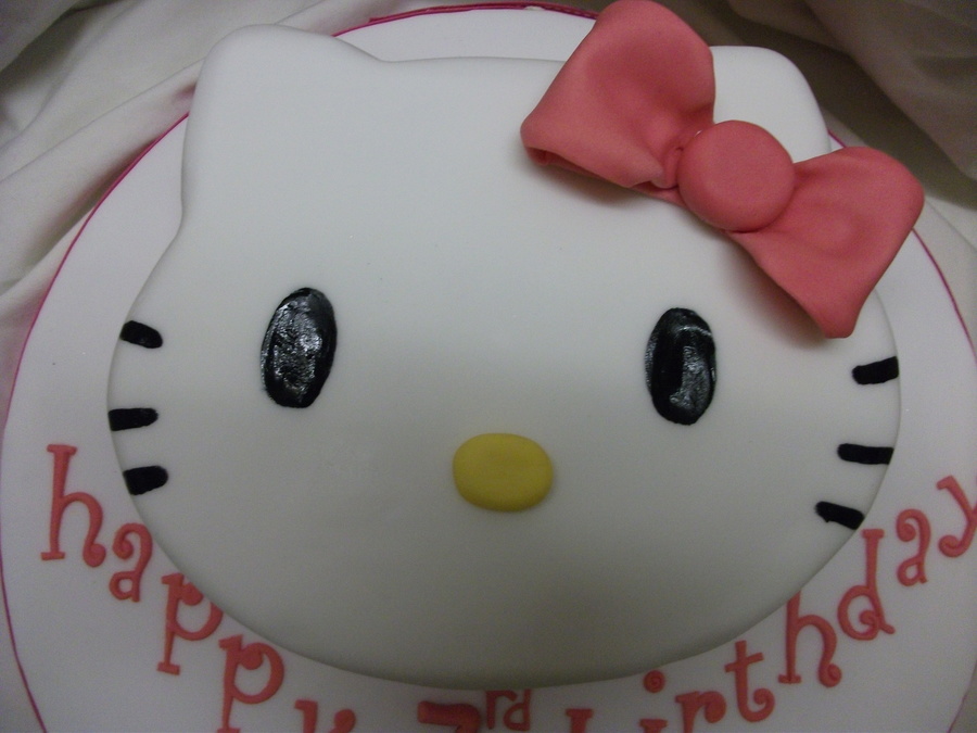 hello kitty face cake, carved from a 10" round vanilla cake. covered with fondant,fondant bow and lettering. eyes and whiskers are hand painted. TFL