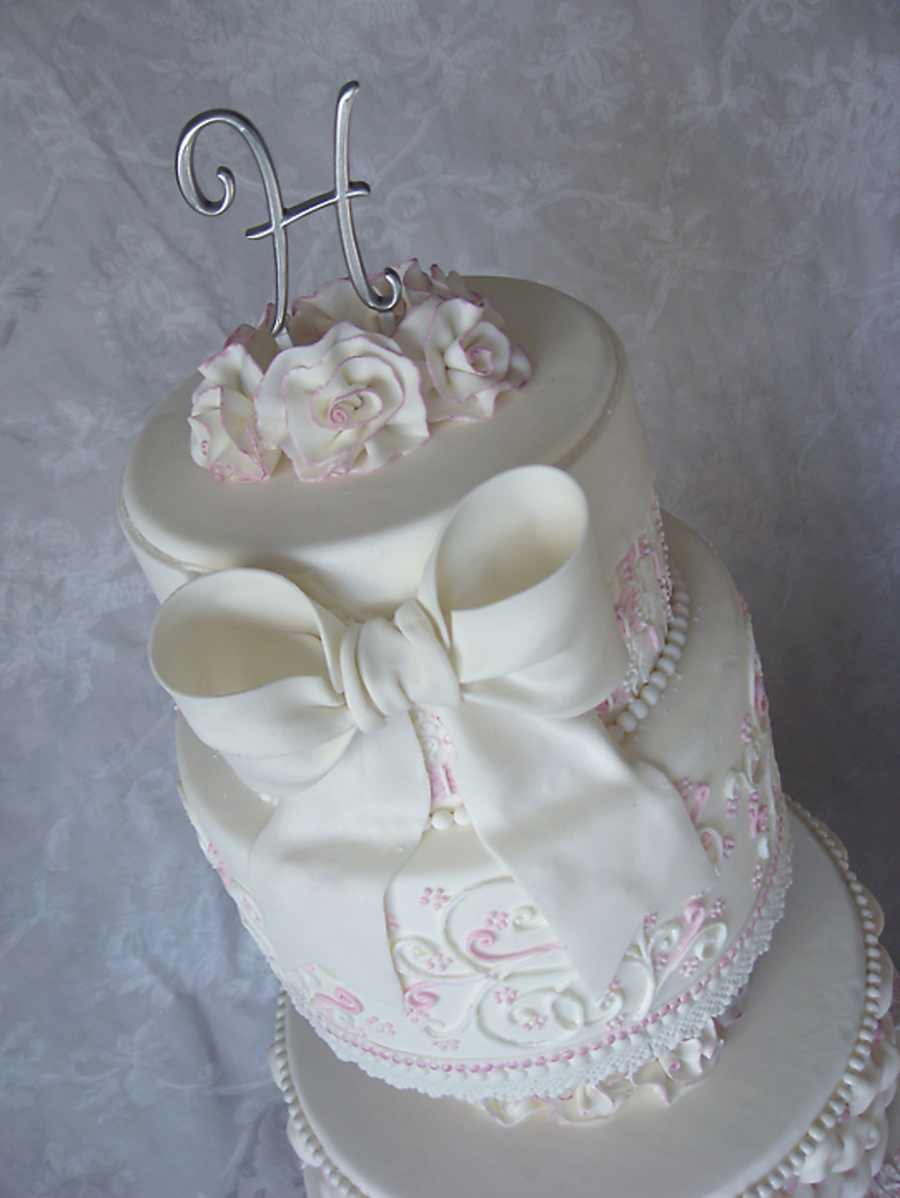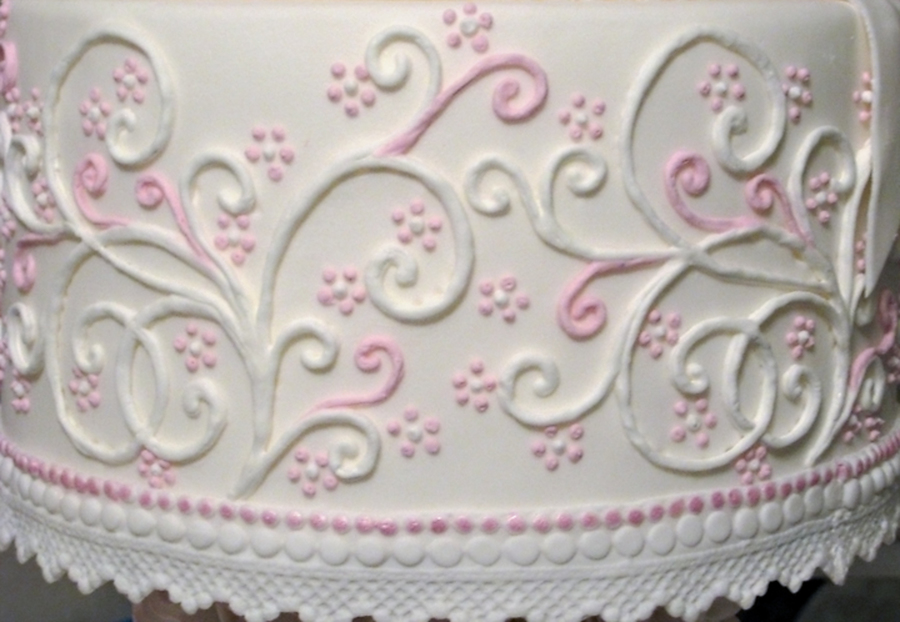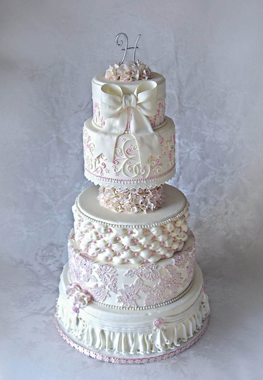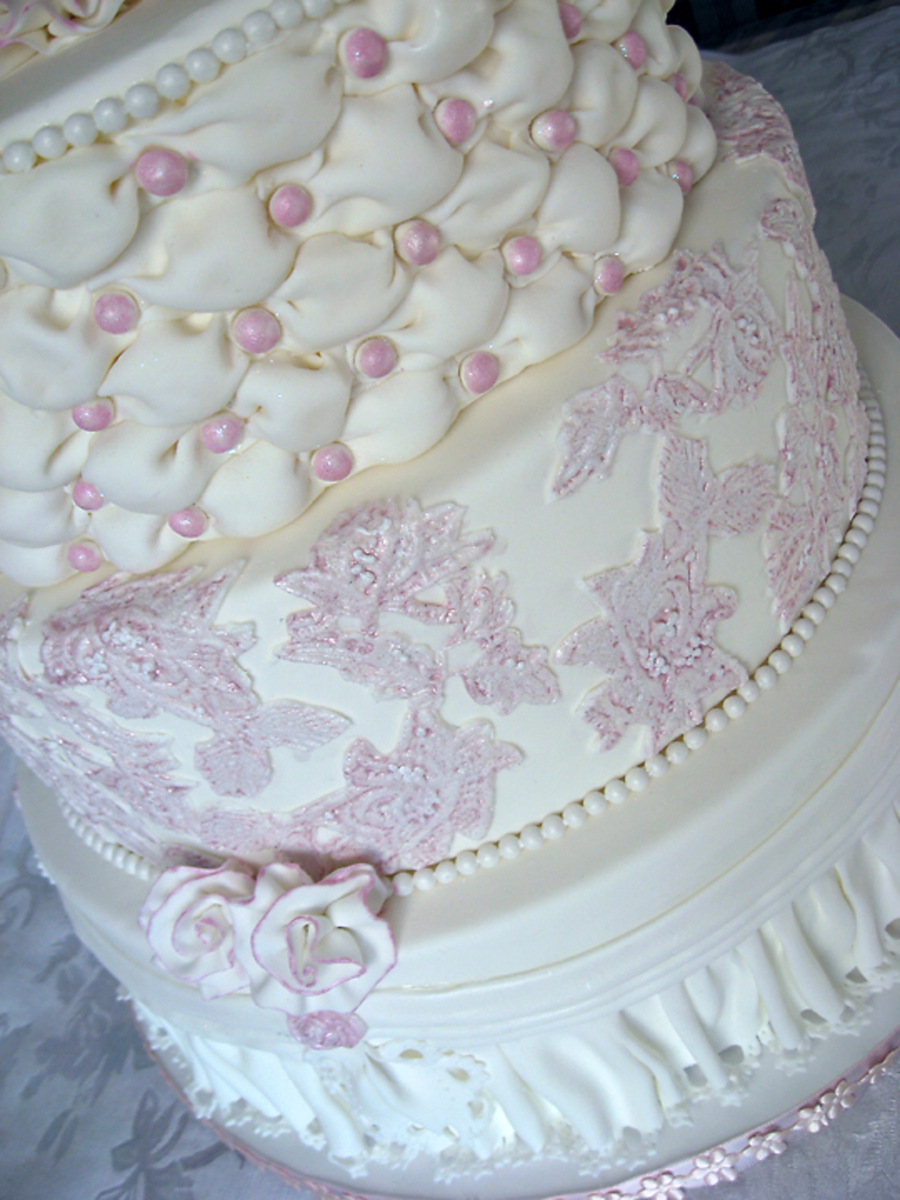 This was a first for me. I wanted to do a different technique on every tier to show a variety of design possibilities, while making a cohesive cake, keeping it seriously romantic, and giving it WOW factor. At the show yesterday it went over really well. I'm thrilled with the result. I really pushed myself on the piping tier as I'm a fondant girl. Not that I want to be... but piping is definitely more of a challenge for me. Anyway... I hope you like it. A professional photographer got a shot of it for me yesterday at the show. I'll post his picture which is probably 100x's better than mine, as soon as I get it.