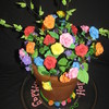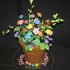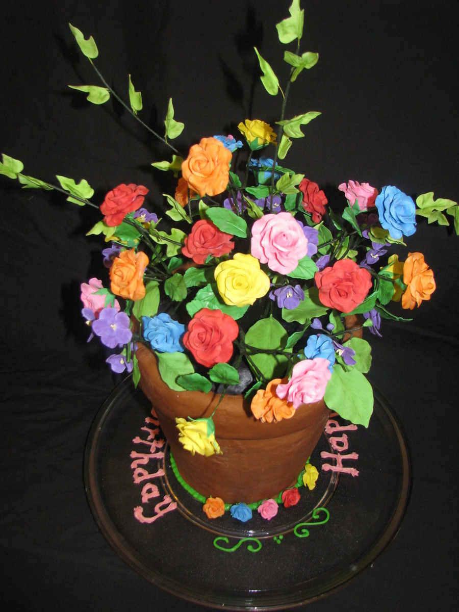 Gumpaste roses and violets fill this flower pot cake.