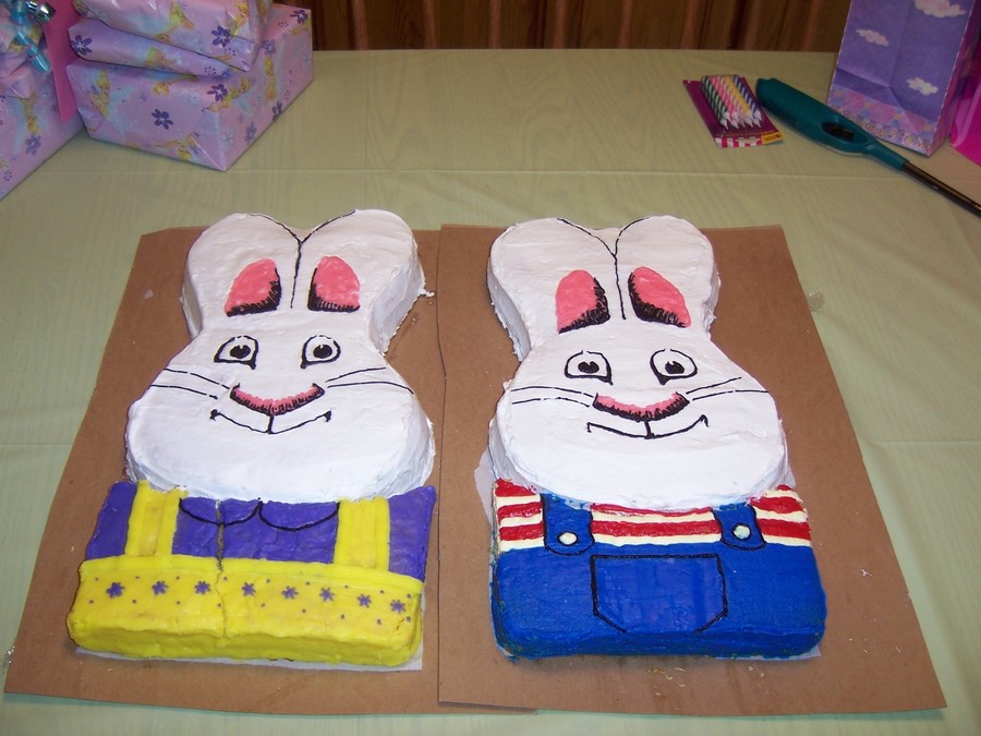 My daughter wanted a Max and Ruby party for her 2nd birthday. This is what my sister in law and I came up with. We used Easter bunny pan and a 13x 9 cake pan to make each one.