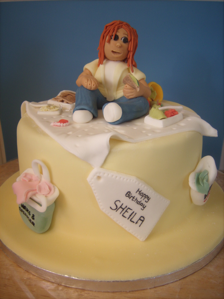 This cake was for a lady who always carrier plastic bags of all kinds and her lunch seperated into individual boxes, so there are boxes of cheese, tomato, cucumber lettuce and bread on the top. TFL x