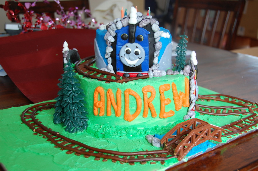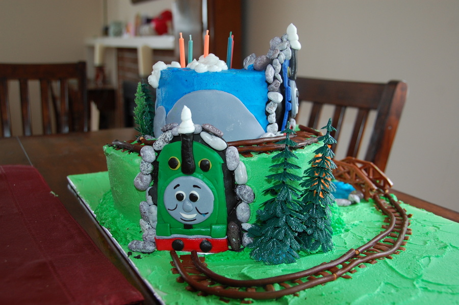 This was made for a HUGE Thomas fan and inspired by so many cakes here on CC. Thomas is coming out the tunnel joined by his friends Percy and James each in their own tunnel. The Bday boys mom did not want the cake covered in fondant- just fondant accents. Everything is edible except the tress and bridge. Thanks for looking.