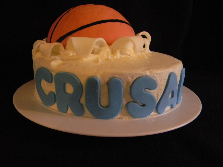Chocolate cake, oreo cream filling, buttercream icing with fondant accents. Ball is rice krispies covered in fondant.