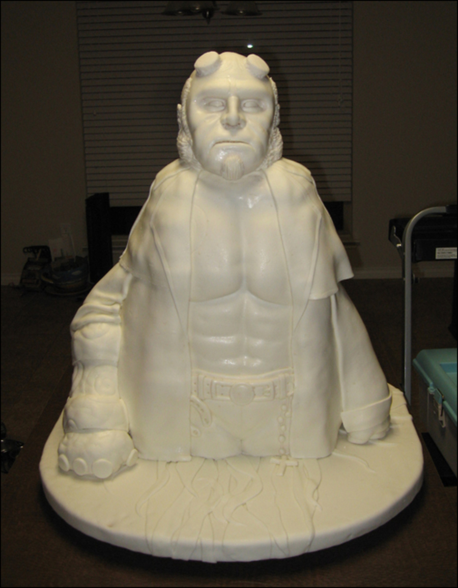 His forearms and head are rice cereal treats and the rest is Devil's Food cake (which I thought was perfect for Hellboy) and he is covered in homemade marshmallow fondant.