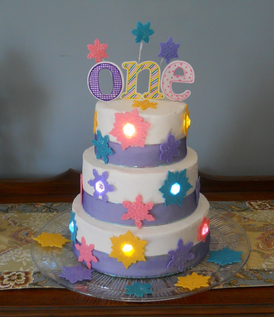 I made this cake for a cousin turning one. Balloon lights were used to illuminate the snowflakes.