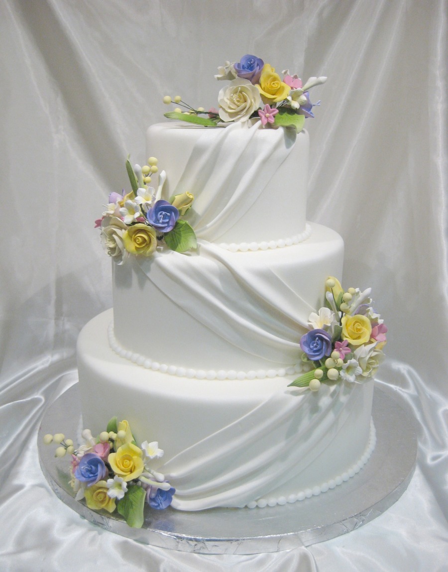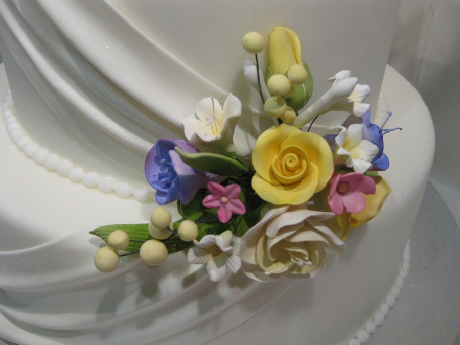 Display cake for a bridal show. Sizes 6, 9 and 12. Fondant covered with gumpaste flowers.