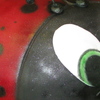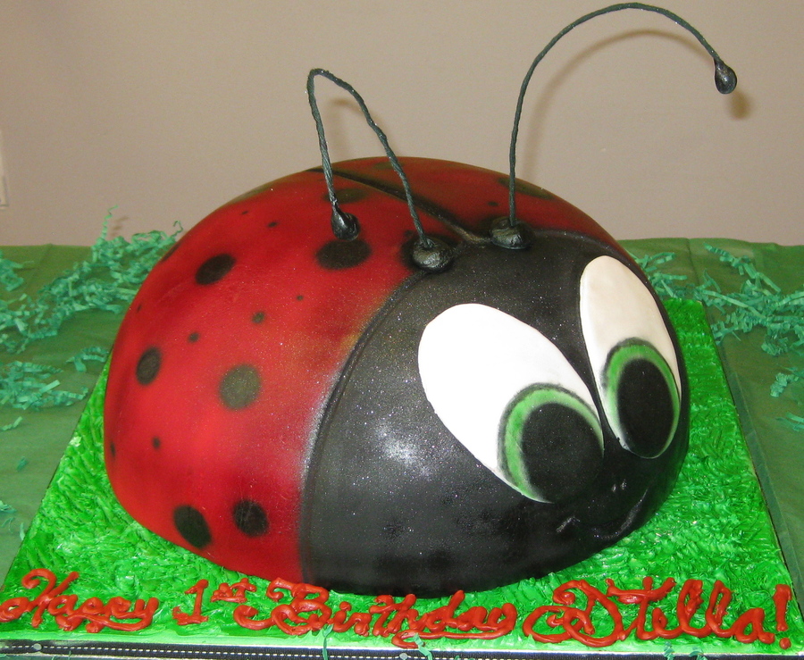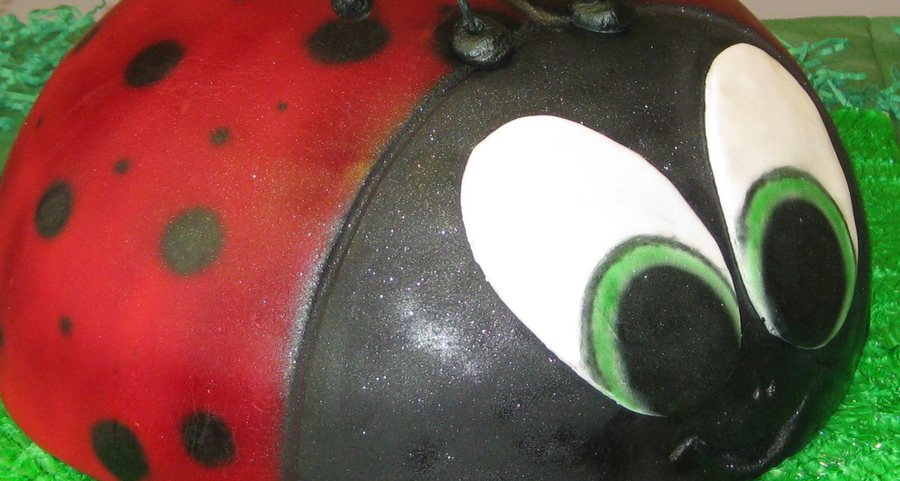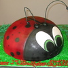 Lady bug cake, made of chocolate cake, with chocolate fudge center and fresh strawberries! Airbrushed spots on!