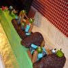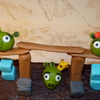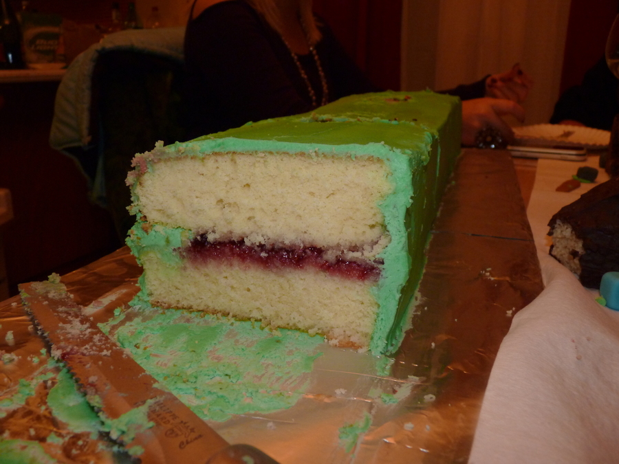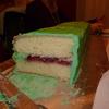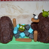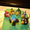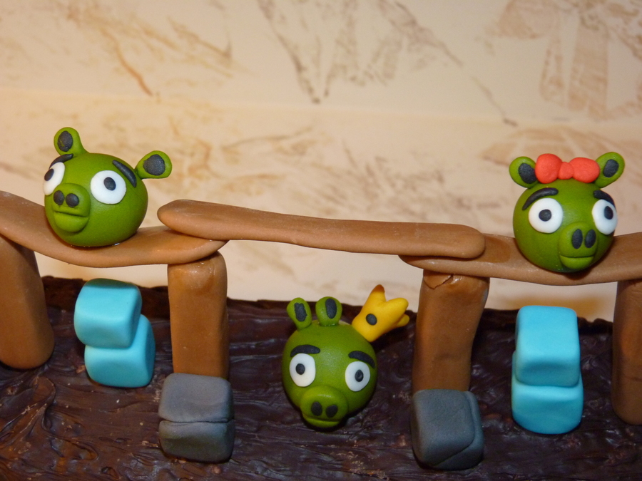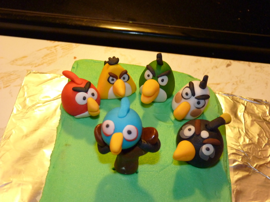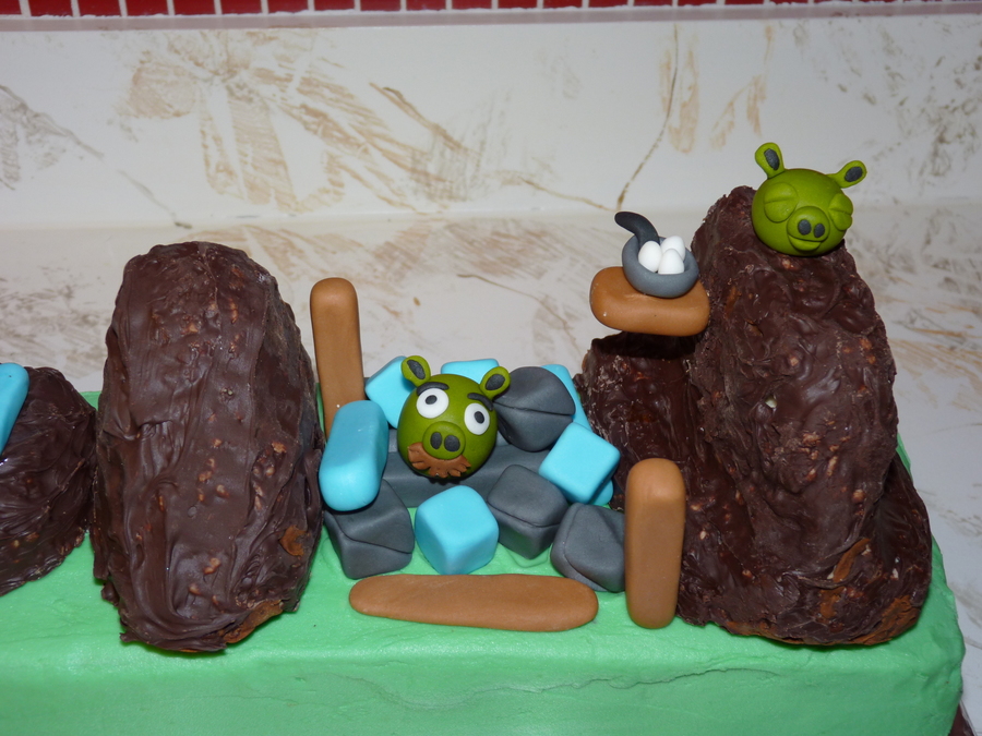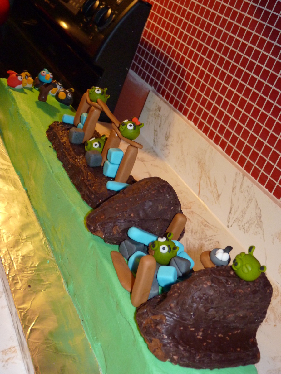 I made this cake for my husbands birthday. He is obsessed with Angry Birds. I made the birds, pigs, blocks and small pieces our of fondant. The dark brown platform and walls are cereal treats covered in chocolate. The cake is lemon pound cake with a raspberry filling and covered in butter cream icing.