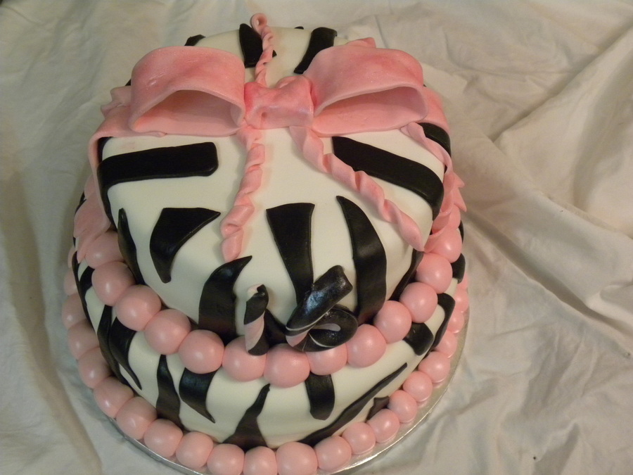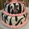 For a sweet 16 Birthday. Bottom tier is a 10" vanilla and top tier is an 8" chocolate cake. Filled and covered with buttercream and mmf. Zebra stripes are made of chocolate fondant.