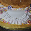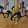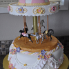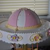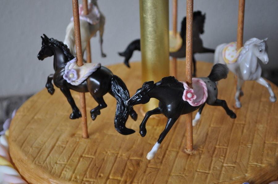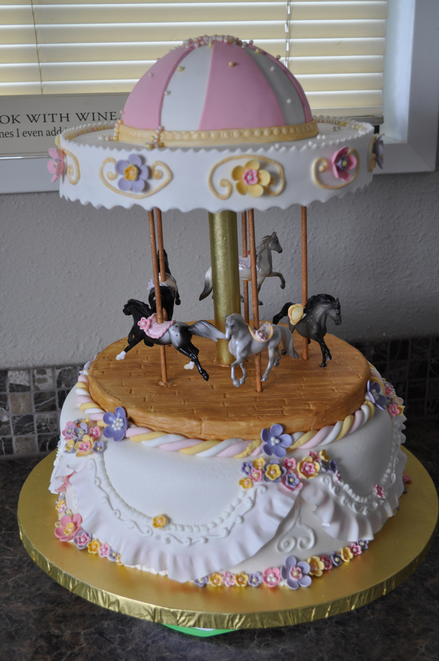 This is a 12" cake on the bottom. The carousel is a 10" cake drum on the bottom, covered in fondant, horse replicas with holes drilled in them with a dowel inserted and saddles of fondant/gumpaste, the top is another 10" drum with a half ball of rkt all covered in fondant. There is a 1 1/2 inch dowel in the center covered in gold foil. The 10" drums and the dowel are fixed together with a large 1/14" washer (top & bottom) and screws. The carousel is only attached to the cake with a large dose of royal icing. It was very stable and traveled well.