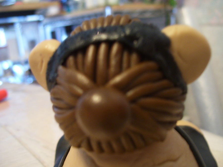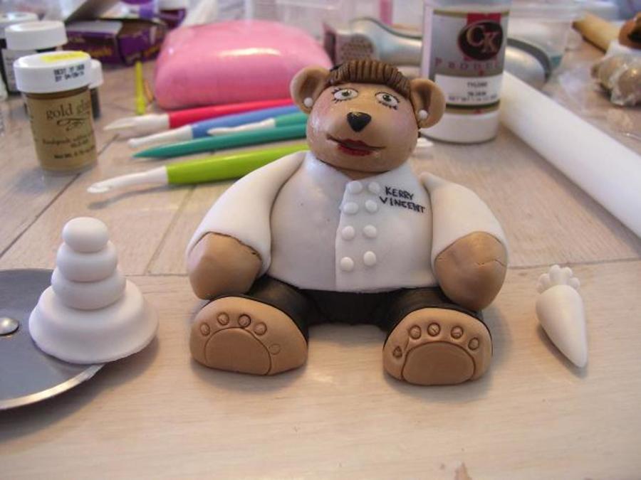 This is the winning "Kerry Bear" just before completion, which is made from Satin Ice and Tylose, turning Kerry Vincent into a bear. As a result, Kerry Vincent mailed us one of her autographed Food Network Judge chef coats. It was a wonderful honor to make this doll. Look at photos of the the hair do to see the back.