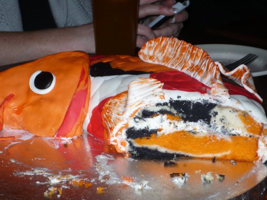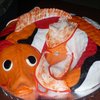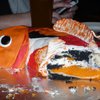 This is my Koi fish. Body is WASC covered in BC fondant. Head is krispy treats. The inside is dyed to look like what I think fish guts should look like. :) hahaha You can also see that he's crying in a couple of the pictures. Unintential of course! We used different colored fondant and rolled them together for the coloring. Then used a fondant tool to make the grooves for the scales.