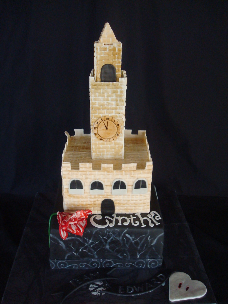 Part one of two twilight cakes for Cynthia. Bottom layer is red velvet with cream cheese filling and top tier is hershey's chocolate with raspberry filling. Iced in white chocolate ganache and covered with mmf. All decoration made with mmf.
