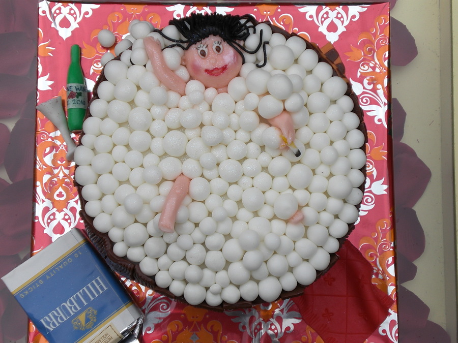 This was for a lady who had her own salon but was retiring. She was thrilled about the fact she was now going to have plenty of time enjoying her favorite things like taking bubble baths and enjoying a nice glass of wine and cigarette. (The cigarettes in the package were actually chocolate ones.) Her former co worker asked me to use all these details in her 'good bye' cake. TFL!