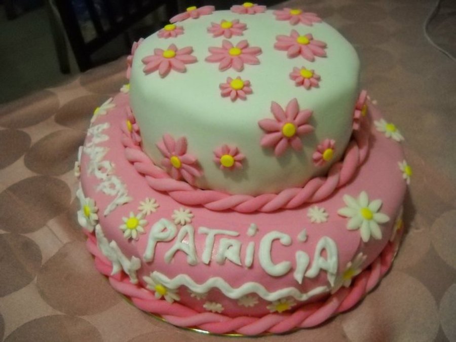 my 2nd tiered cake. I really do not know how to write using a piping bag. I messed up the "happy birthday patricia" message. white cake and dark chocolate cake with rocky road filling (no nuts).