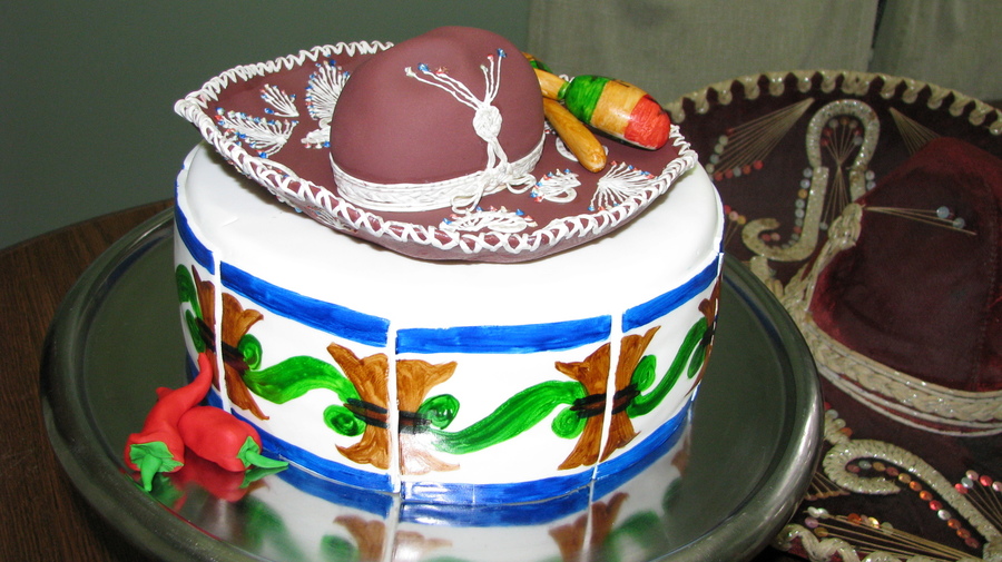 I made this for a friends Mexican themed party. The cake is covered with fondant, then I cut out and hand painted the tiles. The sombrero is fondant/gumpast mix. The real one is in the background. I added a picture of the margarita cupcakes I made to go with thecake. Thanks for looking!